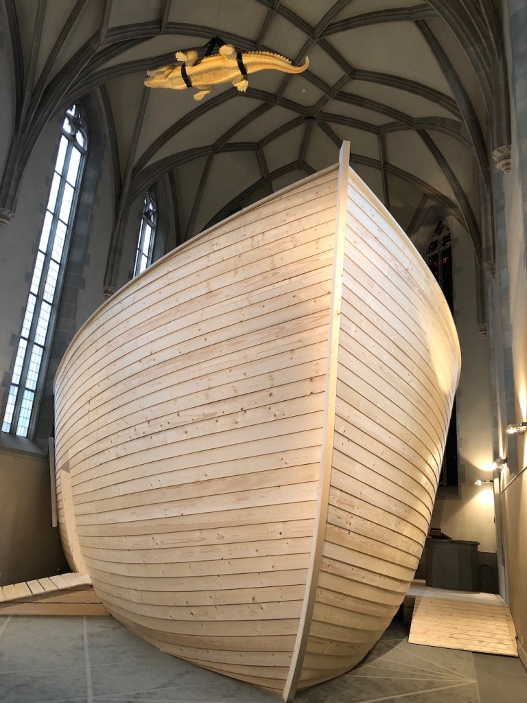 Der Schweizer Theaterdirektor Federico Emanuel Pfaffen (77) hatte die Idee: Wir bauen die «Arche 2.0», ein Schiff für unsere Zeit, als Symbol für einen neuen Anfang und als Hoffnungsanker in Zeiten der Unruhe und Perspektivenlosigkeit. Unter der Schirmherrschaft von Stadtpräsidentin Corine Mauch ist dieses Schiff nicht nur Objekt, sondern auch Bühne: ein Ort für einen Austausch mit der Stadt, mit vielen Stimmen aus Wissenschaft, Kultur, Kunst und Gesellschaft. Die «Arche 2.0» ist ein Projekt der Zürcher Altstadtkirchen und wird bis Oktober 2025 in der Wasserkirche beheimatet sein. Szenographie Simeon Meier (53).